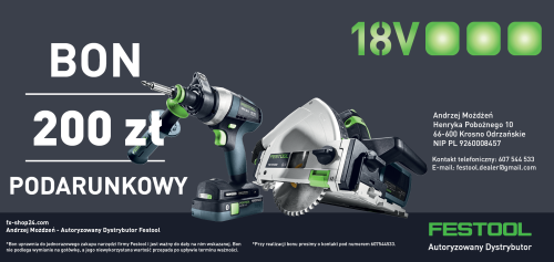 Bon uprawnia do jednorazowego zakupu narzędzi firmy Festool w sklepie fx-shop24.com. Bon nie podlega wymianie na gotówkę, a jego niewykorzystana wartość przepada po upływie terminu ważności.