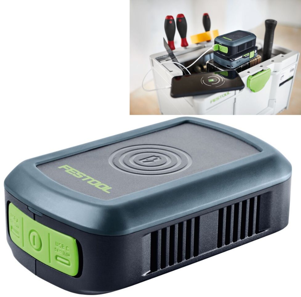 Idealny zestaw: Akumulator typu Tabless BP 18 TBX 4 C-ASI FESTOOL 578745 i Ładowarka do telefonu PHC 18 FESTOOL 577155. Nie potrzebujesz prądu na budowie by twój telefon był naładowany.
