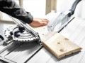 Przedłużona jednostka prowadząca umożliwia precyzyjne i łatwe przycinanie dużych materiałów płytowych. Odpowiednia przykładnica kątowa zapewnia precyzyjne cięcia pod kątem prostym oraz ułatwia łatwe i precyzyjne ustawianie dowolnych kątów. Do pilarki stolikowej Festool TKS 80