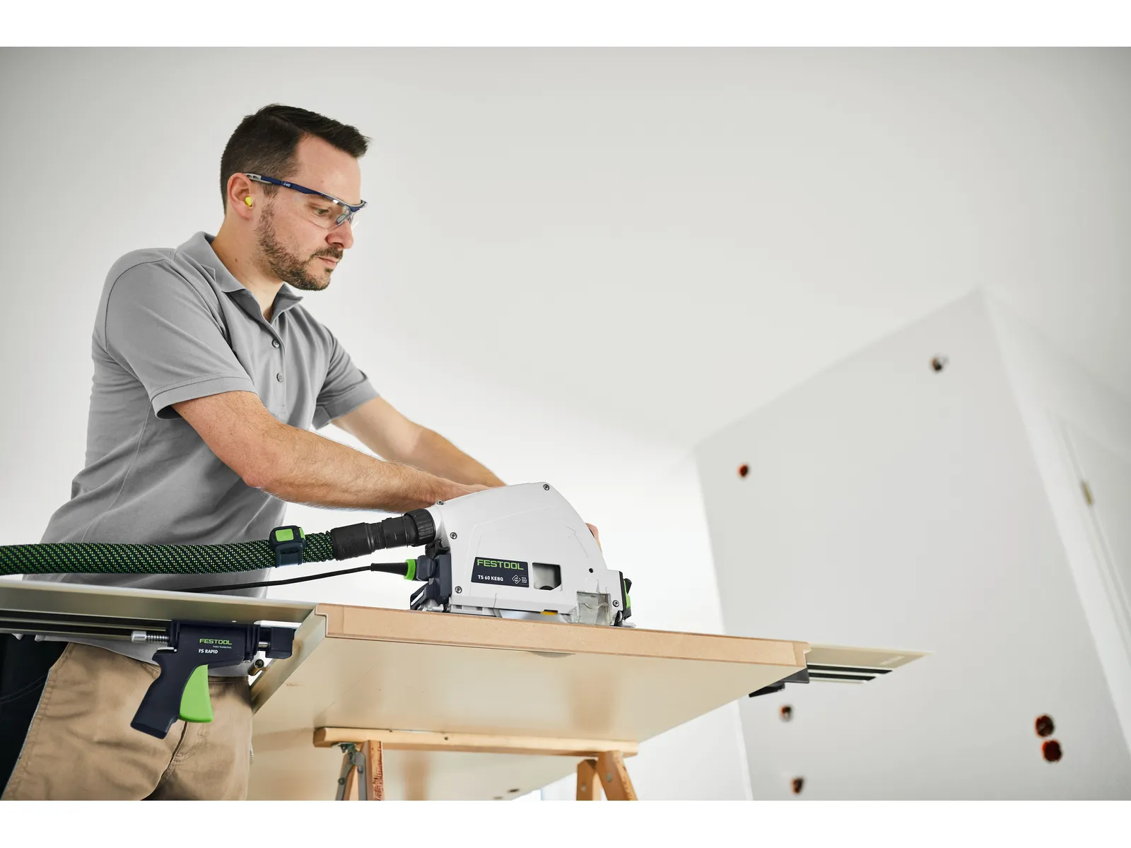 Zagłębiarka TS 60 KEBQ-Plus posiada wyjątkowe zabezpieczenie KickbackStop działające w mgnieniu oka chroni element obrabiany i minimalizuje ryzyko obrażeń. Ta najbardziej uniwersalna pilarka tego typu jest idealnie dopasowana do całego systemu cięcia Festool. Głębokość cięcia 60 mm zapewnia doskonałe wyniki pracy. Nadaje się oczywiście również do cięć ukośnych i do cięcia płyt litych. Bezkonkurencyjna jest możliwość połączenia TS 60 K z prowadnicą FSK.