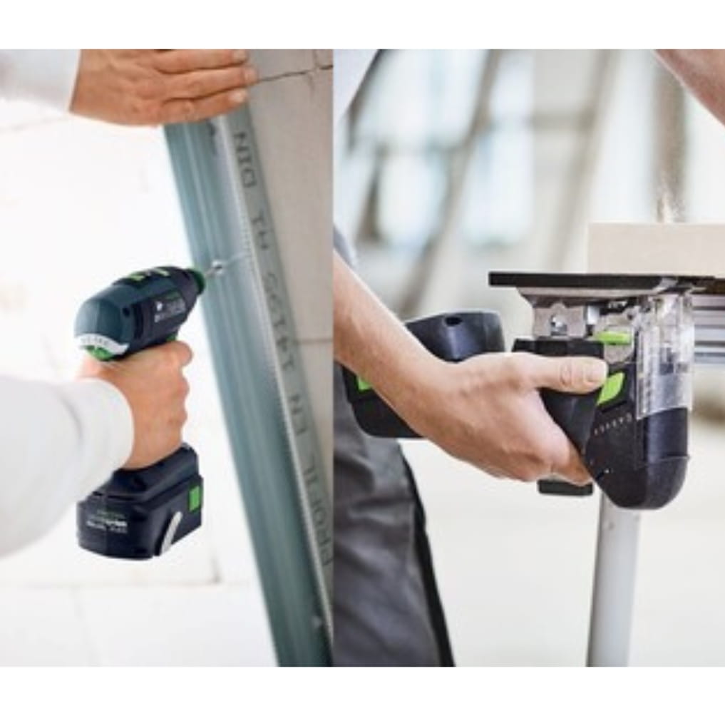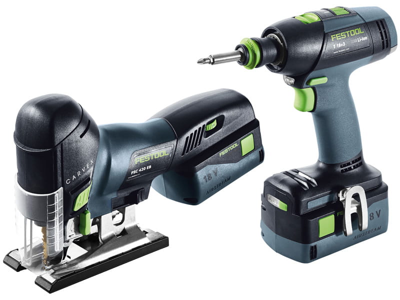 Dwa razy 18 V. Dwukrotna moc jak z gniazdka. Dwukrotnie energooszczędny, trwały, bezszczotkowy silnik EC-TEC. Akumulatorowa wiertarko-wkrętarka T 18+3 to mała elektrownia o wysokiej skuteczności i imponującym momencie obrotowym. A wyrzynarka akumulatorowa CARVEX PSC 420 – moc cięcia oraz łatwe pokonywanie krawędzi w kompaktowej i poręcznej formie. A za wyjątkowy komfort użytkowania CARVEX PSC 420 wraz z odkurzaczem mobilnym Festool odpowiadają akumulatory Festool Bluetooth®: w połączeniu odkurzaczem mobilnym Festool z obsługą Bluetooth® umożliwiają automatyczne włączenie odkurzacza w trybie AUTO w momencie uruchomienia wyrzynarki.