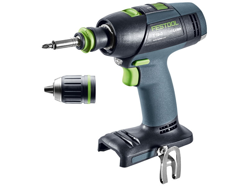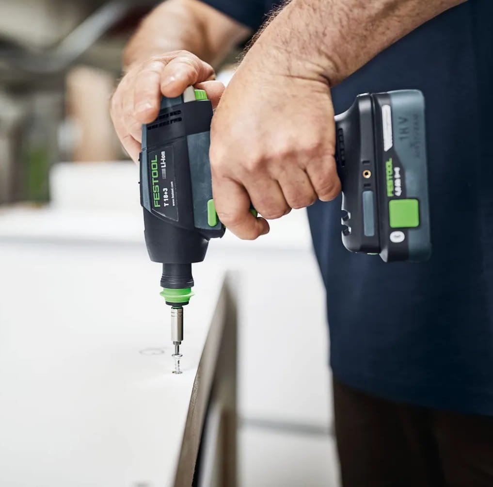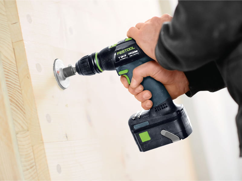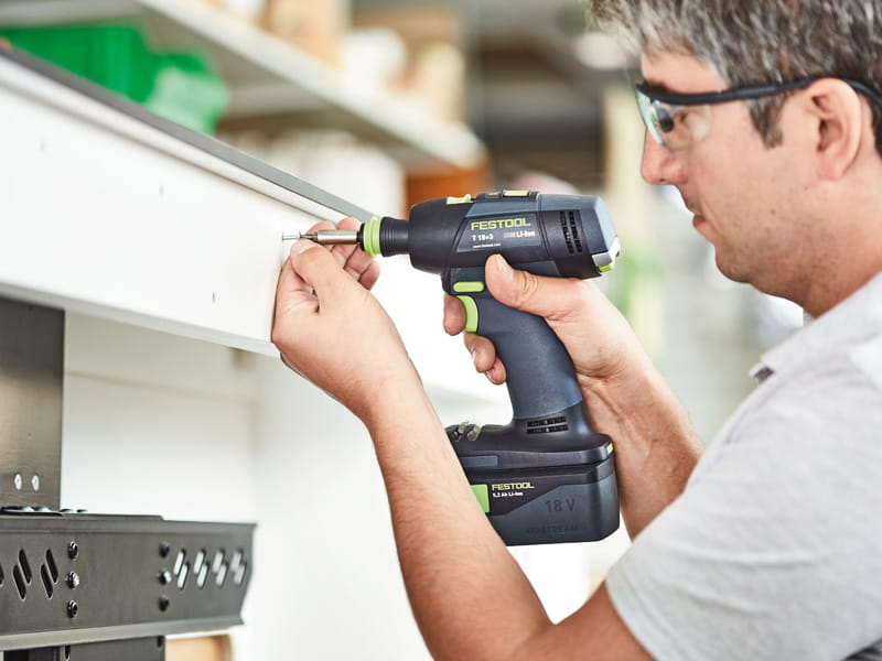 Wkrętarka akumulatorowa Festool T18+3 to pełna elastyczność podczas wiercenia i wkręcania: w pełni elektroniczna regulacja momentu obrotowego, system szybkiej wymiany CENTROTEC, nasadka kątowa i mimośrodowa oraz ogranicznik głębokości rozwiązują wszelkie problemy związane z wierceniem i wkręcaniem.