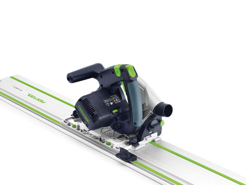 - Kabel i wąż ssący są prowadzone przez nakładkę zabezpieczającą na końcu szyny prowadzącej bez zakleszczania się podczas cięcia zagłębiarką lub ręczną pilarką tarczową.
