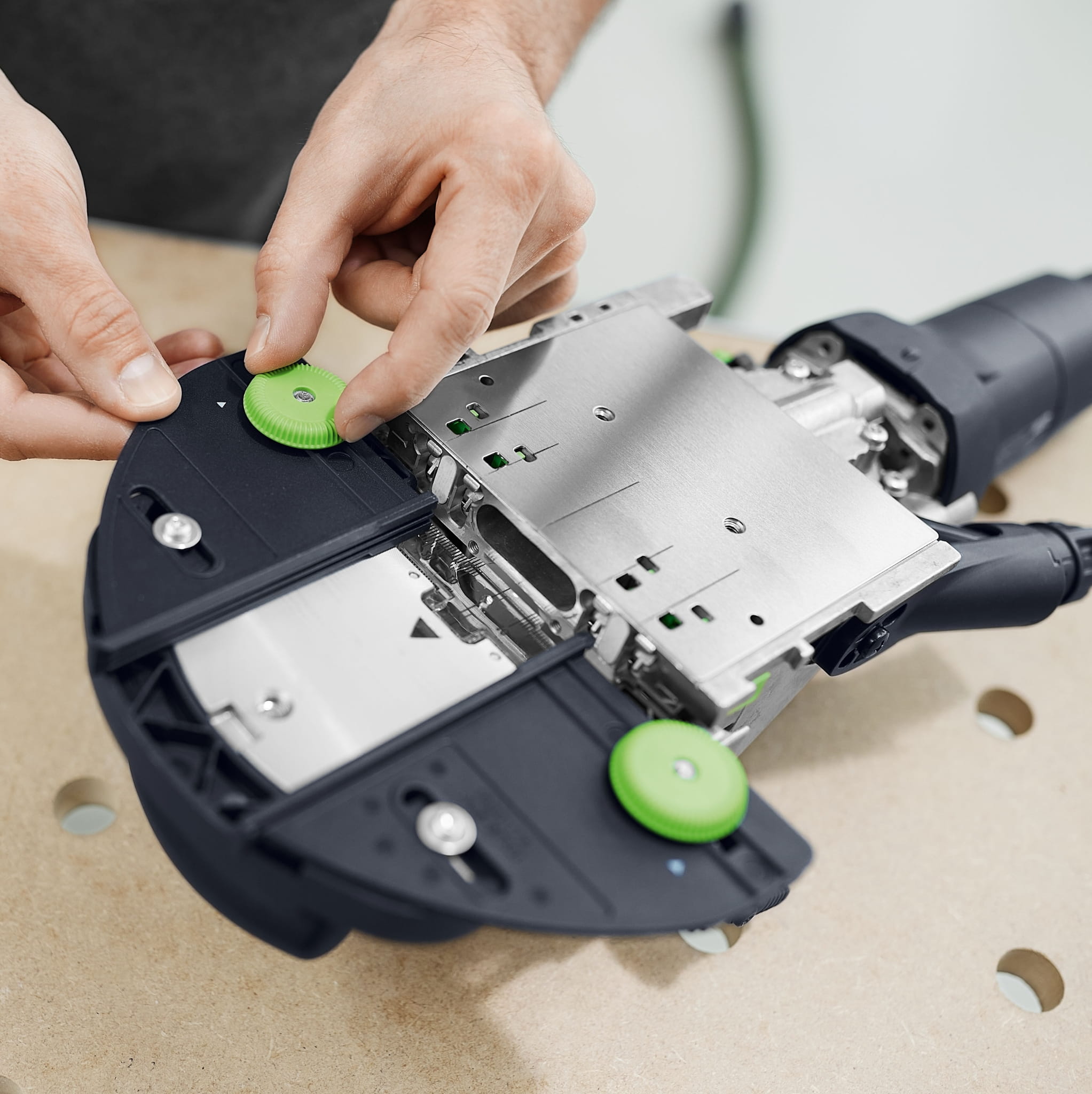 Modułowa frezarka do krawędzi akumulatorowa MFKC 700 EB-Basic FESTOOL 578011 idealnie frezuje po obwodzie, żaden kabel się nie zakręci. Łatwe i dokładne ustawianie głębokości frezowania z dokładnością do 1/10 mm