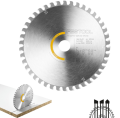 W pakiecie promocyjnym do pracy z uwzględnieniem właściwości materiału: Zestaw Multi-Material jest tak wszechstronny i zróżnicowany, jak wymagania dotyczące różnych materiałów. Zestaw ten składa się z trzech różnych tarcz do pilarek tarczowych zapewniających doskonałe rezultaty podczas pracy z drewnem, laminatem i płytami łączonymi żywicą melaminową, a także z aluminium i tworzywem sztucznym.