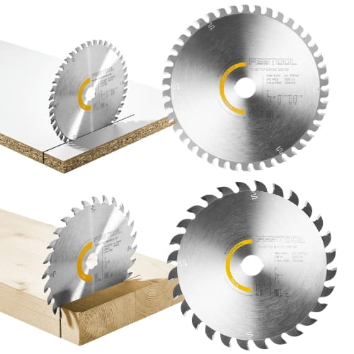 Tarcza WOOD FINE CUT FESTOOL 205765 do gładkich i pozbawionych wyrw cięć w drewnie litym, jak również do płyt powlekanych lub fornirowanych oraz Tarcza UNIVERSALNA FESTOOL 205764 do docinania płyt stolarskich, sklejki, płyt Multiplex/drewna wielowarstwowego, surowych płyt wiórowych, płyt pilśniowych MDF i HDF