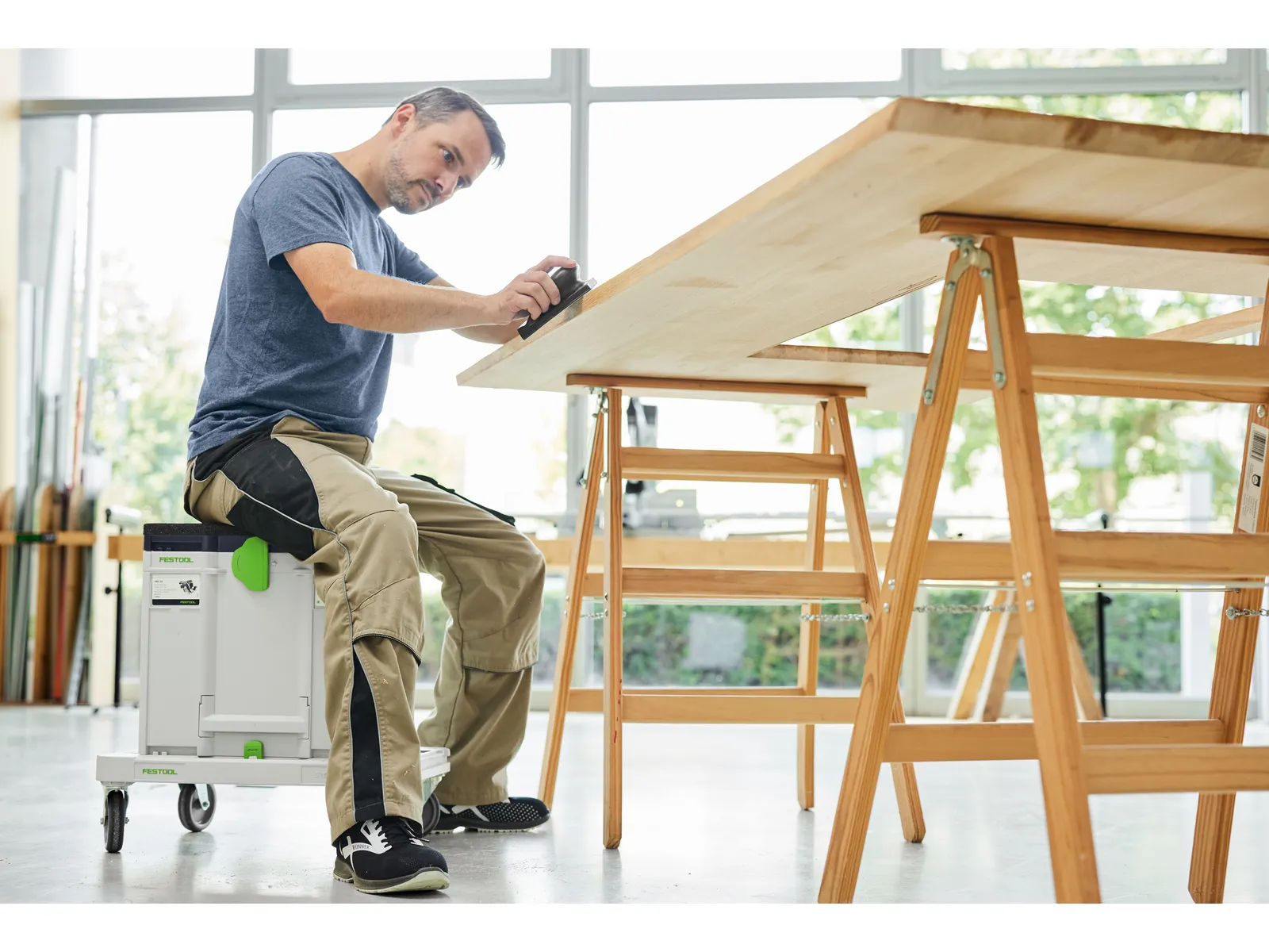- Kiedy położysz poduszkę na systainerze SYS-RB na wózku- to masz gotowy mobilny stołek. Idealne rozwiązanie w przypadku prac wykonywanych blisko podłogi, np. przy montażu listw cokołowych lub pracy pod parapetem.