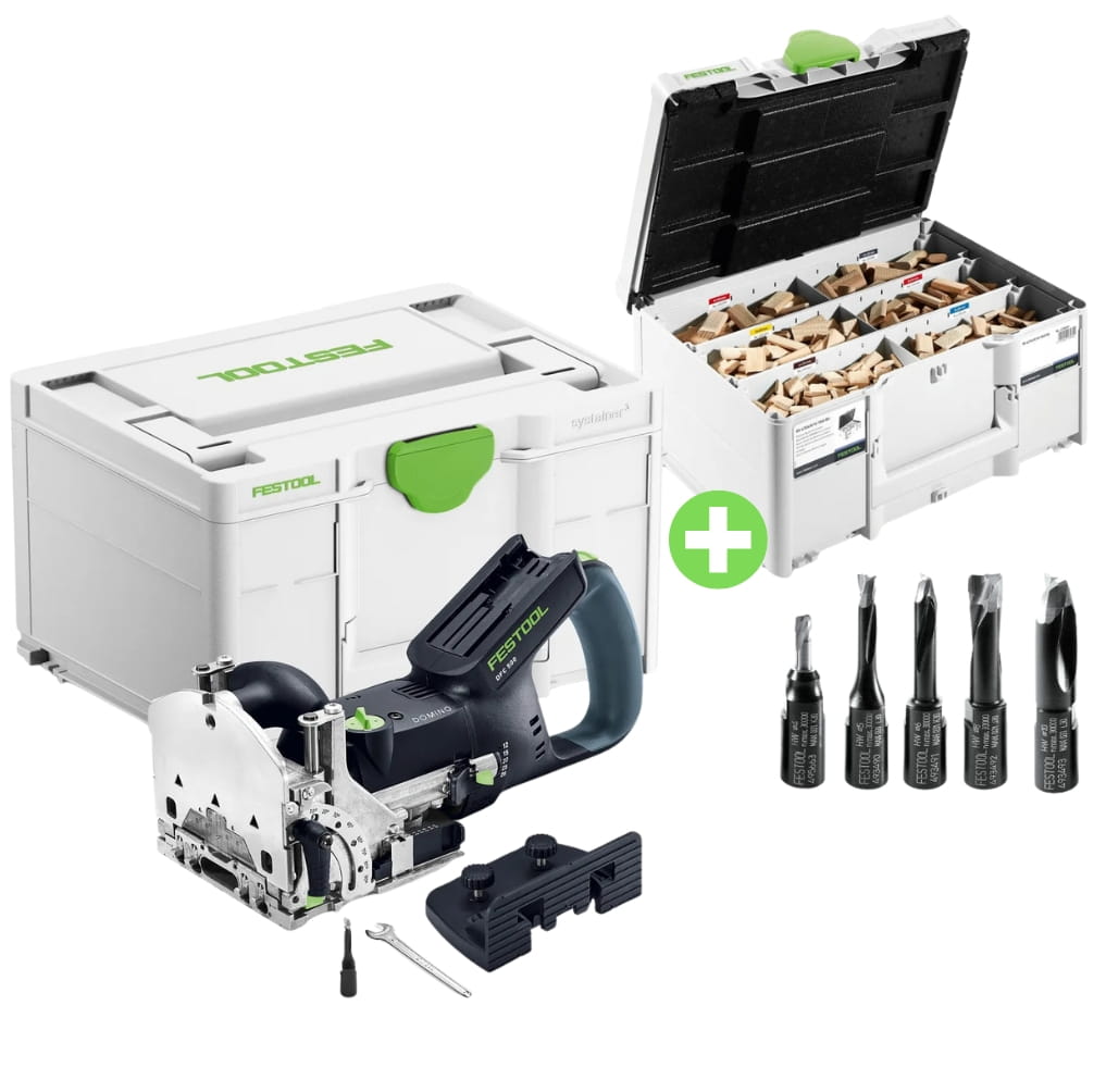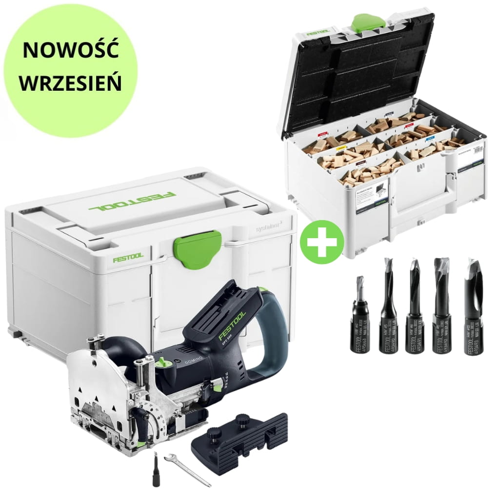 - Wyposażenie systemowe pasujące do obydwu frezarek do połączeń DOMINO