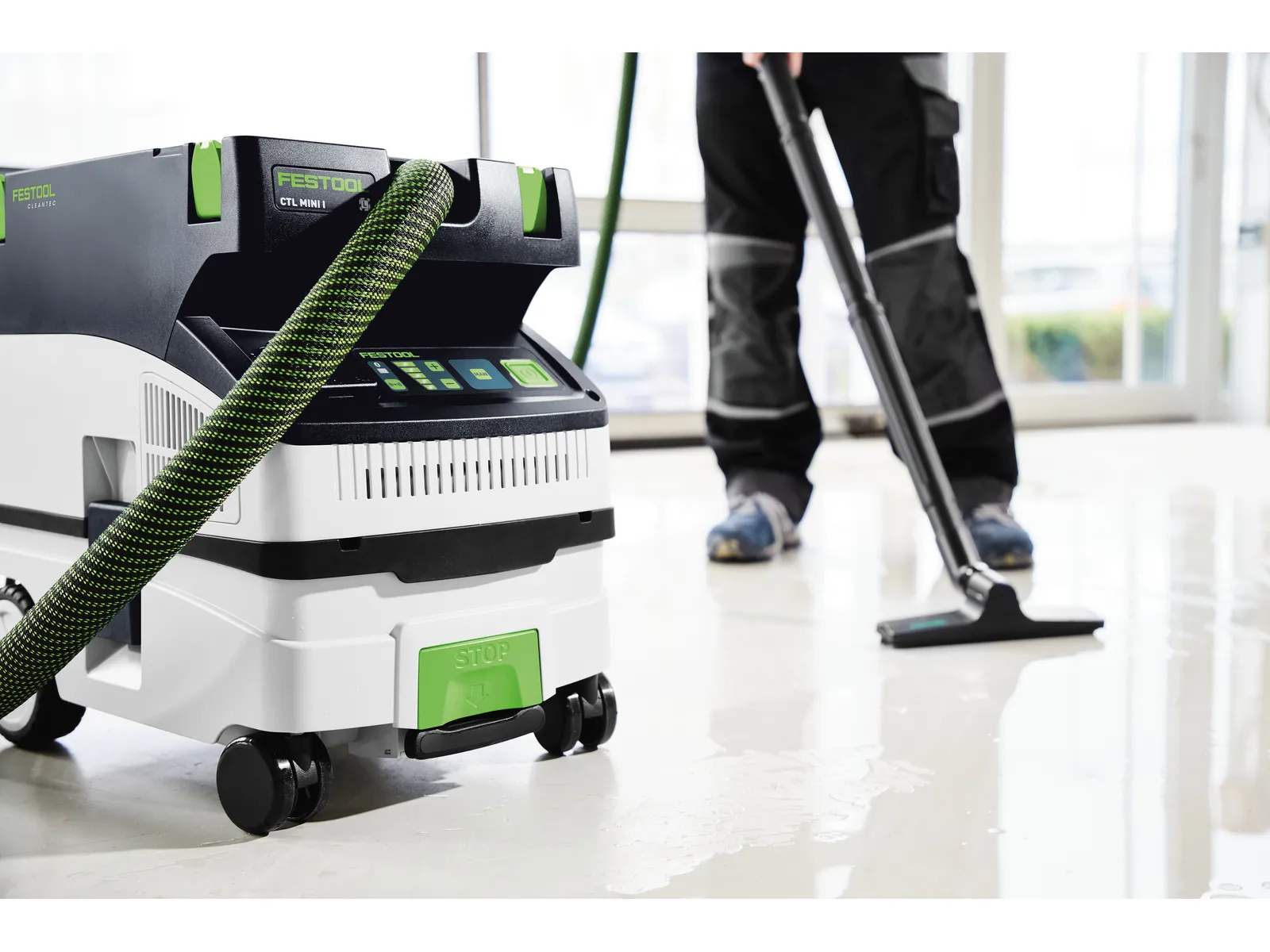CTM MIDI I to mobilny odkurzacz klasy M do pyłów drewnianych i mineralnych. Sprawdza się na montażu, w remontach i przy pracy z elektronarzędziami Festool – od szlifowania, przez cięcie i frezowanie, po wiercenie na sucho i drobne prace „na mokro” z LevelStop.
