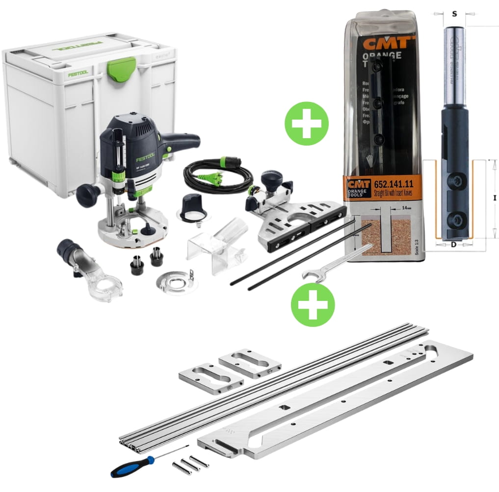 Frezarka OF 1400 EBQ-Plus 576207 + Szablon do łączenia blatów kuchennych APS 900/3 Nowszy model nr 578727 + Frez CMT 652.141.11