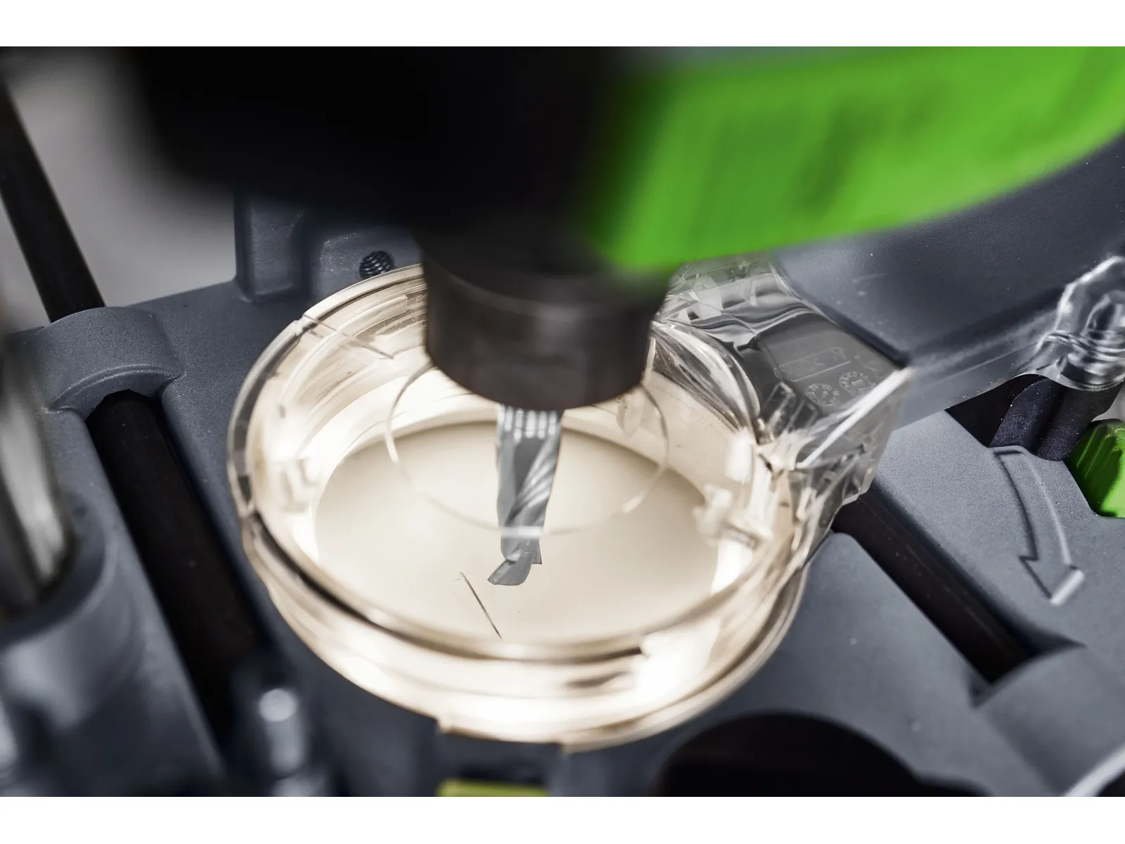 ✅ Łapacz wiórów umożliwia idealne odsysanie. Wraz z osłoną ssącą i odkurzaczem mobilnym Festool zapewnia optymalną wydajność odsysania 99% przy frezowaniu krawędzi.